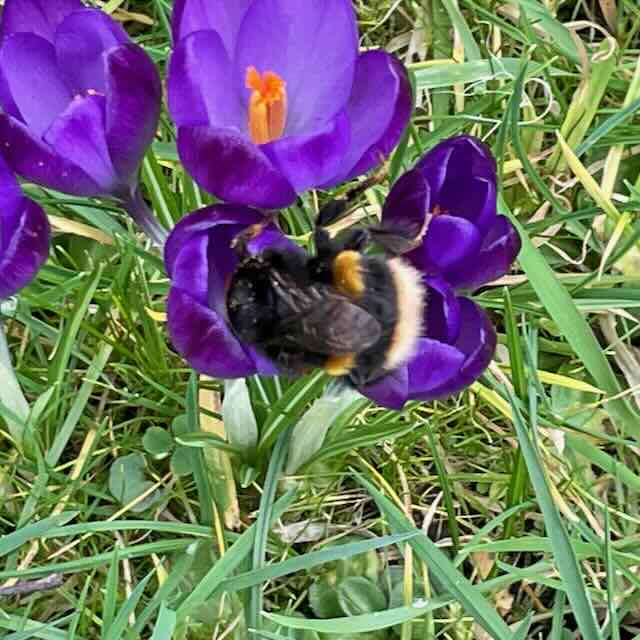 The first bumblebees of the year have been spotted! The first was a buff-tailed queen in the wildflower meadow (formerly the front lawn), looking for nectar and pollen in the crocuses that have opened. The second whizzed past in the kitchen garden and all I can say for sure is that it wasn’t a buff-tailed.