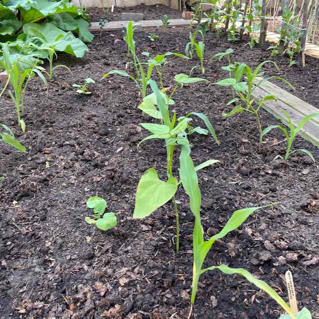 In the kitchen garden, the scribes are experimenting with something called Three Sisters planting. This originated in Mesoamerica and it works like this: sweetcorn is planted alongside climbing beans. The sweetcorn provides something for the beans to climb up, while the beans fix nitrogen in the soil for the sweetcorn to use. Squash is sown inbetween them to shade out weeds and keep the moisture in the soil so that everything benefits. Different indigenous cultures used different varieties of maize, beans and squash, but the principle was the same. However, it would appear that timing is the key to doing this right as the maize needs to be tall enough for the beans to climb up. At the present rate, the sweetcorn needs to get growing fast so that the beans don’t outstrip them.